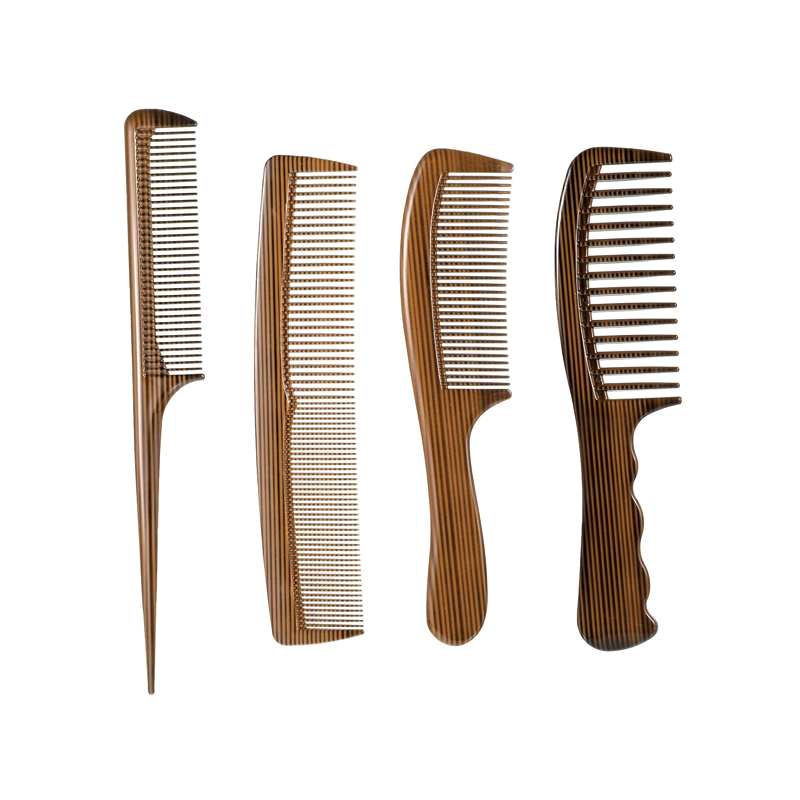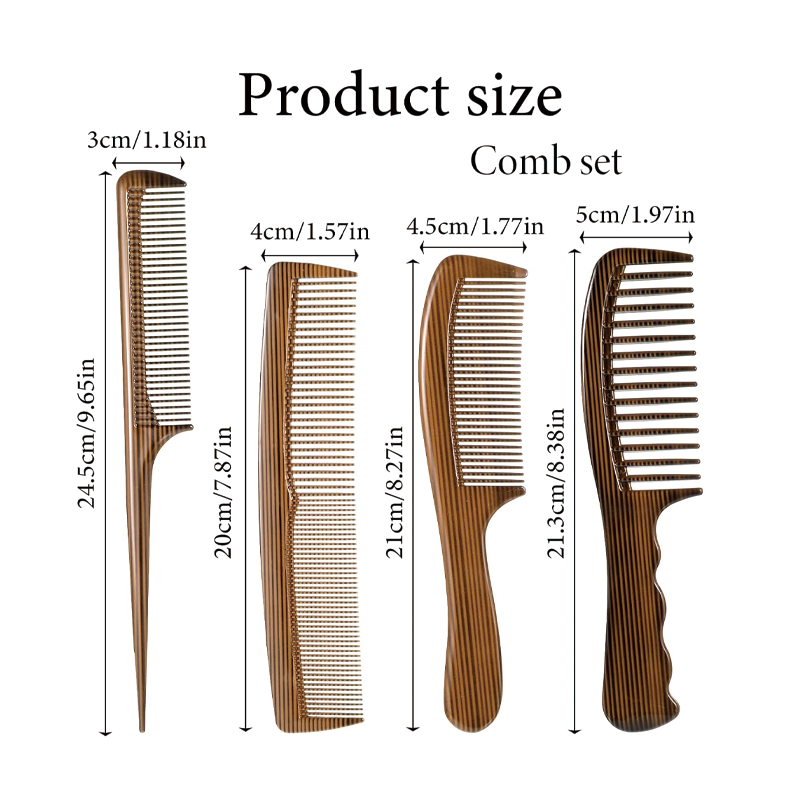 Set of 4 professional hair combs with wood grain finish | Wide-tooth comb / Beard comb / Fine-tooth comb / Tail comb